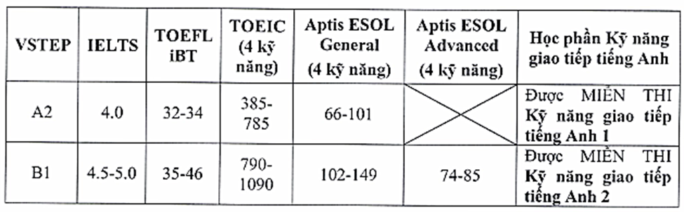 Lưu ý: Sinh viên chỉ được sử dụng chứng chỉ để miễn thi các học phần Kỹ năng giao tiếp tiếng Anh trong 7 học kỳ đầu tiên. Từ học kỳ thứ 8 trở đi, sinh viên đăng ký học như trên.